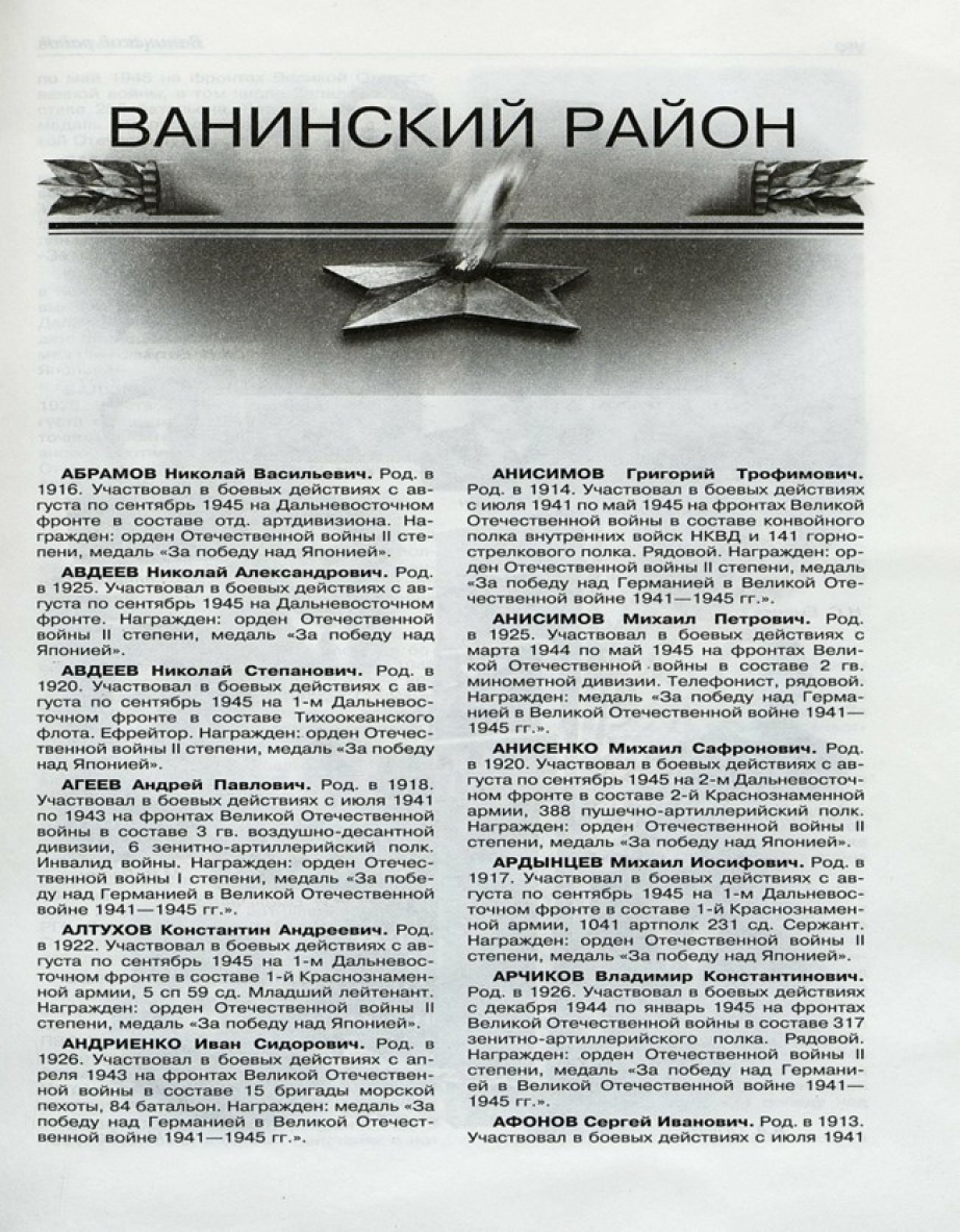 Родился в 1926 г. Участвовал в боевых действиях с 06 декабря 1944 г. по 14 января 1945 г. на фронтах Великой Отечественной войны в составе 317 зенитно-артиллерийского полка. Воинское звание: рядовой. Справка ЦАМО № 4/165894. Награжден: орден Отечественной войны II степени, медаль «За Победу над Германией в Великой Отечественной войне 1941-1945 гг.». Удостоверение участника ВОВ: № А-110780 от 19.06.1984. Умер 16.01.1989. Имя ветерана Великой Отечественной войны внесено на стелу в парке Победы п. Ванино.
