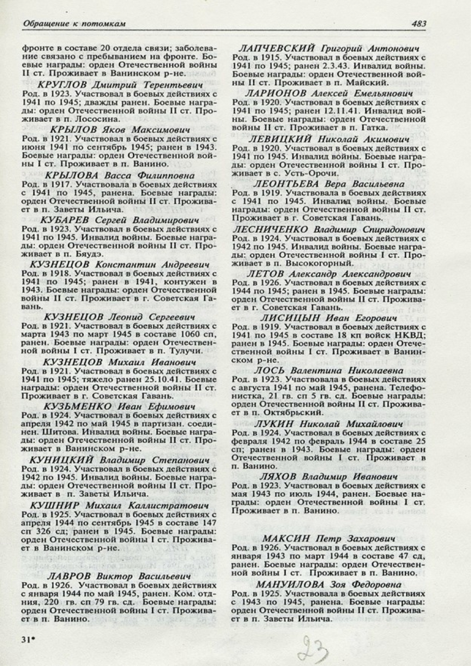 Родился в Курганской области в селе Карачино (или Кочарино) 12 августа 1921 г. Призван Тернейским РВК Приморского края. В марте 1942 г. призван в ряды Советской армии, прошёл всю войну в качестве связиста до 1946 г. Должность: телефонист 7-го отдельного гвардейского батальона связи, 5-й стрелковой … Краснознамённой ордена Суворова дивизии. Участник боёв на 3-м Белорусском фронте. Получил ранение в Восточной Пруссии 06.04.1945. За боевые заслуги отмечен Правительственными наградами, одной из которых является «Медаль за отвагу», орден Отечественной войны 1 степени, медаль за «Победу над фашисткой Германией». Победу Леонид Сергеевич встретил в Восточной Пруссии. Из рядов Советской Армии был демобилизован в июне 1946 г. Награждён медалью за трудовое отличие. Работал с 1972 г. в леспромхозе водителем лесовоза. Ушёл из жизни 29.05.2004, похоронен в п. Тулучи. Имя ветерана Великой Отечественной войны внесено на стелу в парке Победы п. Ванино.